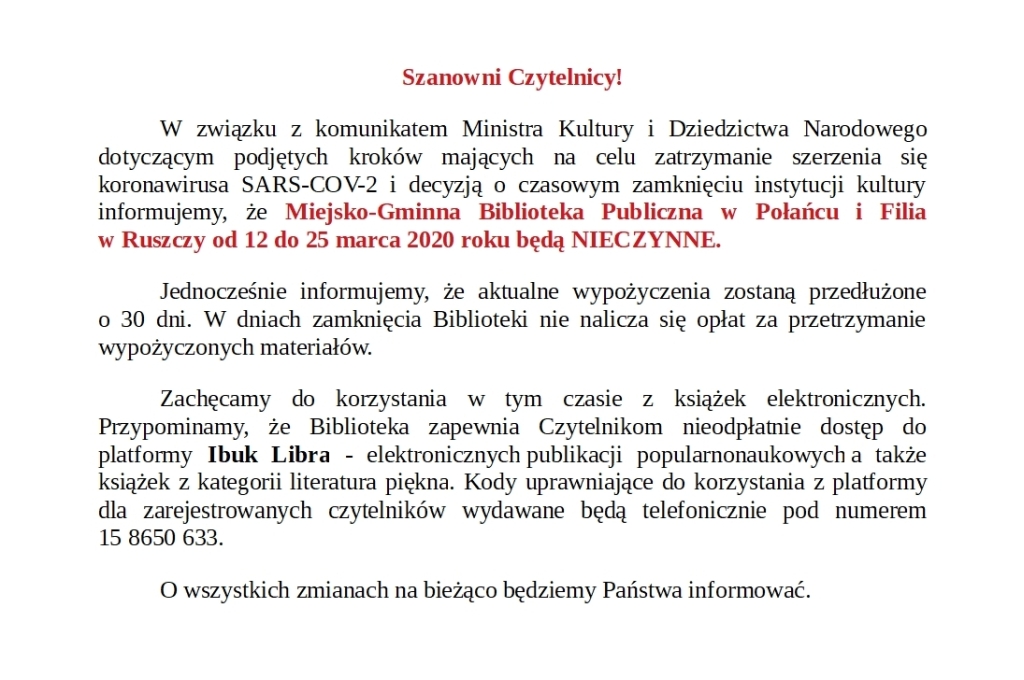 Odpowiedź na pytanie co czytać, przy braku dostępu do tradycyjnej książki to wyzwanie dla nas. Warto zajrzeć na stronę internetową i profil na Facebooku Biblioteki, gdzie podpowiadamy jak znaleźć książki w formie cyfrowej do czytania na telefonie, czytniku i komputerze oraz audiobooki do słuchania. W pierwszej kolejności proponujemy zainteresowanym skorzystanie z zasobów platformy Ibuk Libra, do której mamy wykupiony dostęp. Można na niej znaleźć wiele atrakcyjnych tytułów e-booków pomocnych do nauki, jak i czytanych dla przyjemności i uatrakcyjnienia czasu wolnego.