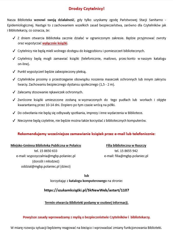 Co robią bibliotekarze w tym trudnym czasie odcięci od Czytelników? Jedni pracują a inni wykorzystują urlopy. Ci, którzy pracują w Bibliotece odpowiadają na liczne pytania telefoniczne i mailowe. A Czytelnicy pytają najczęściej o to czy mogą wypożyczyć książki, kiedy będą mogli przyjść do biblioteki i co mają w takim razie czytać?! Te powtarzające się pytania dowodzą, jak bardzo jesteśmy potrzebni.
