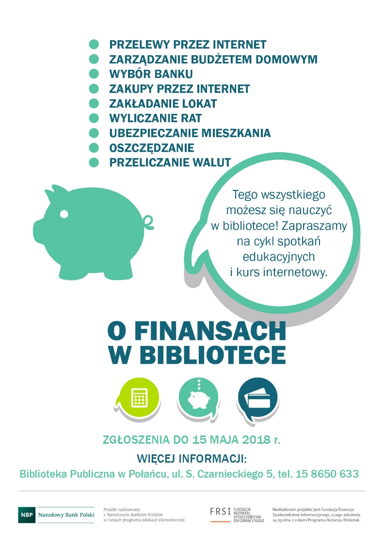 Miejsko-Gminna Biblioteka Publiczna w Połańcu zaprasza do wzięcia udziału w nowym projekcie "O finansach... w bibliotece", skierowanym do osób powyżej pięćdziesiątego roku życia.