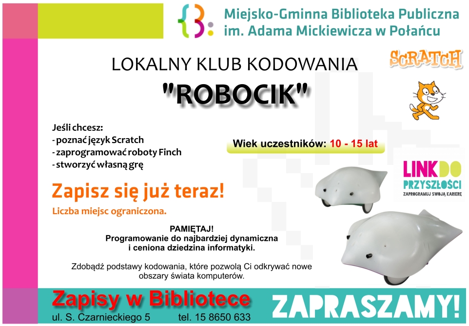 26 lutego 2016 roku (piątek) o godz. 1600 odbędzie się pierwsze spotkanie Lokalnego Klubu Kodowania "Robocik". Uczestnicy dowiedzą się czym jest kodowanie oraz poznają podstawy kodowania w języku Scrach. Dodatkowo będą stawiać piersze kroki w kodowaniu robotów Finch.