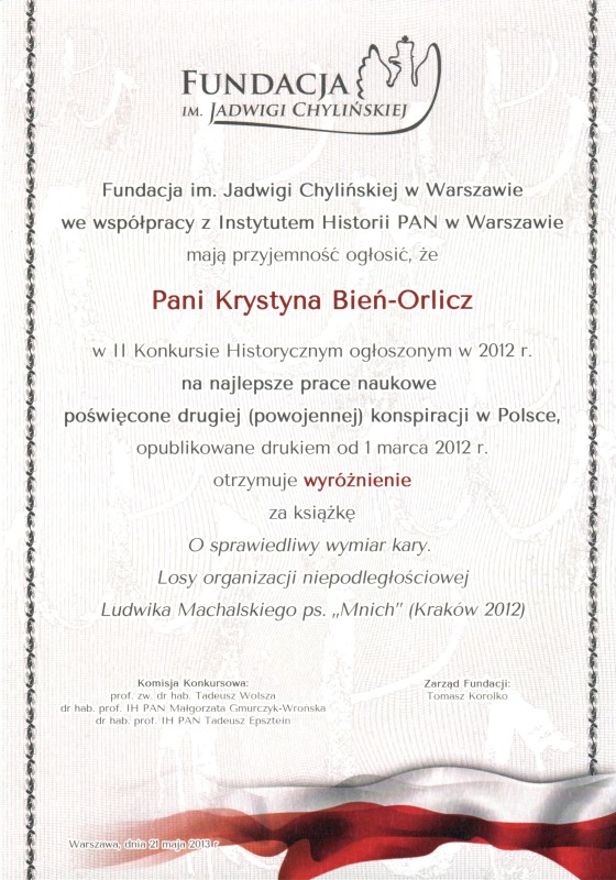 Miło nam jest poinformować, że Pani Krystyna Bień-Orlicz otrzymała specjalne wyróżnienie za książkę O sprawiedliwy wymiar kary. Losy organizacji niepodległościowej Ludwika Machalskiego ps. "Mnich" w II edycji Konkursu Historycznego organizowanego przez Fundację im. Jadwigi Chylińskiej w Warszawie we współpracy z Instytutem Historii PAN w Warszawie.