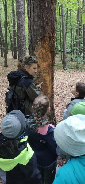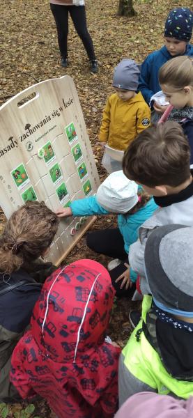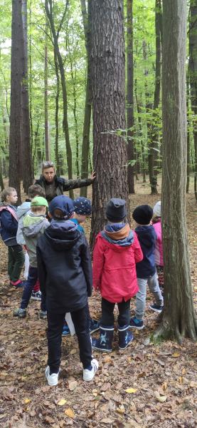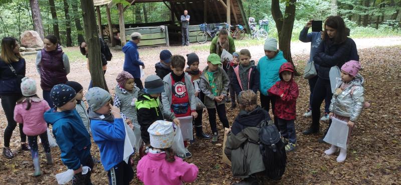 W samym środku lasu, kilka kilomtrów od naszego miasta na tak zwanym Zarudziu, tuż obok pomnika poświęconemu myśliwym spotkaliśmy się ze specjalnym gościem, dla którego las jest drugim domem. Nasza bardzo sympatyczna pani leśnik poprowadziła Biblioludki spacerkiem po lesie opowiadając po drodze o jego bogatym życiu, na które często nie zwracamy uwagi. W trakcie wycieczki nazywała drzewa i pokazywała ukryte w zaroślach rośliny. Mówiła o zwierzętach mających tu swoje domy. Wyjaśniała, jak należy zachowywać się w lesie. Uczulała by podczas leśnych wycieczek nie niszczyć przyrody i nie płoszyć zwierząt. Przecież człowiek w lesie jest tylko gościem i tak powinien się zachowywać. Dzieci do otrzymanych na początku spotkania woreczków zbierały skarby lasu: szyszki, liście, patyczki i żołędzie, które wykorzystały później do dalszych zabaw. A było ich wiele. Biblioludki grały w kółko i krzyżyk z patyków i szyszek, urządzały wyścigi ślimaków (oczywiście bez udziału prawdziwych zwierzątek), „tkały” obrazek z gałązek i liści oraz ćwiczyły rzucanie kasztanami do celu. Biblioludki świetnie się bawiły na łonie natury czerpiąc pełnymi garściami, z tego co przyroda ma im do zaoferowania. Gdy poczuli zmęczenie i zaczął doskwierać im głód, wspólnie z rodzicami rozpalili ognisko i upiekli kiełbaski. Przy okazji dowiedziały się, że w lesie nie można palić ognia poza miejscami do tego wyznaczonymi. Na zakończenie spotkania pani leśnik zaproponowała Biblioludkom rozwiązywanie krzyżówek i łamigłówek o lesie, które dzieci wraz z pomocą opiekunów chętnie uzupełniły utrwalając zdobytą wiedzę.
