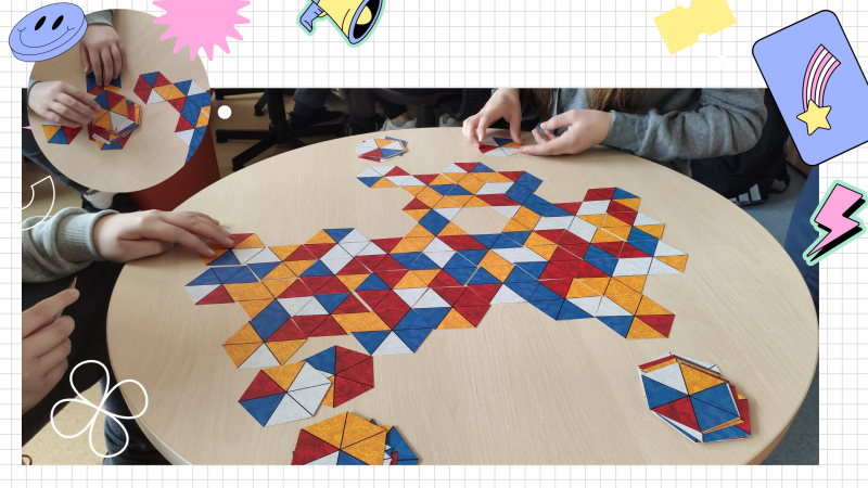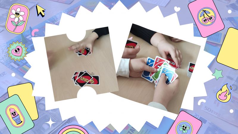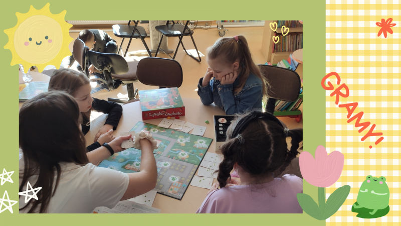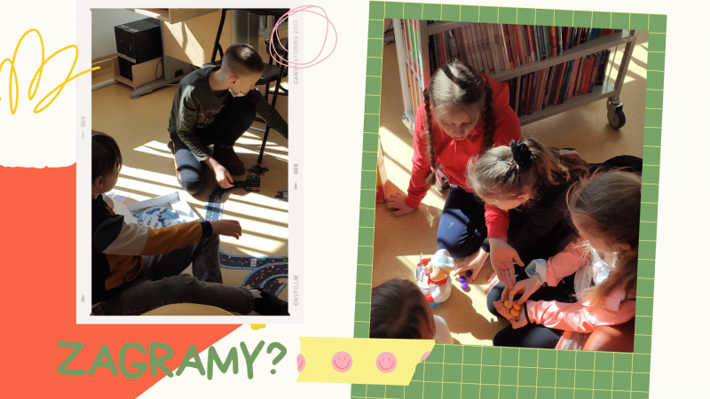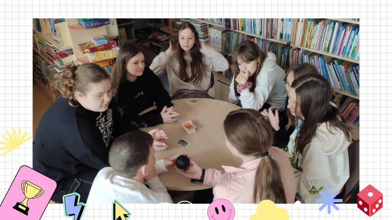 Zdjęcie kolorowe, siódmoklasiści grający w gry planszowe w Bibliotece