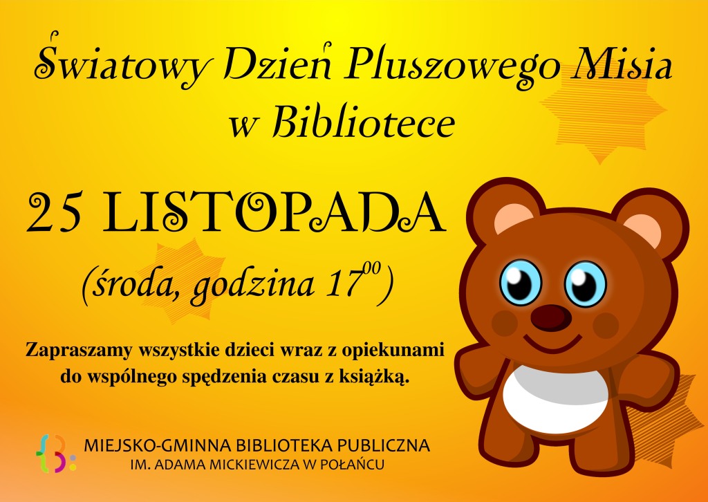 25 listopada obchodzony był Światowy Dzień Pluszowego Misia. Z tej okazji do Biblioteki przybyły dzieci wraz z rodzicami i wysłuchały opowiadania „Urodziny Pluszowego Misia”. Mali Czytelnicy przy niewielkiej pomocy dorosłych wykonali misiowe maski, które mogli zabrać do domu. Na koniec zajęć był czas na swobodną zabawę i zwiedzanie Biblioteki.