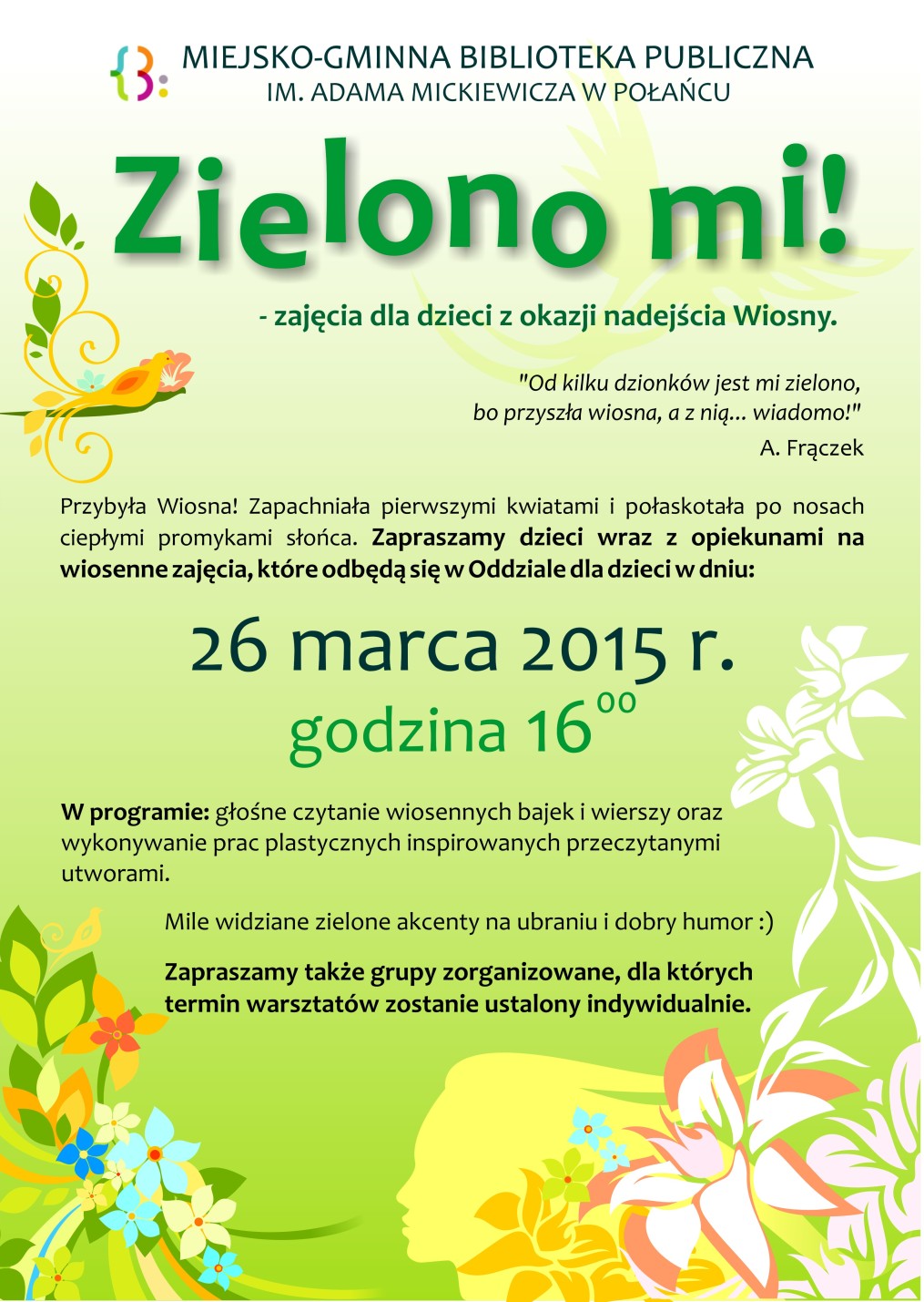 W marcu i kwietniu w Bibliotece w Połańcu wraz z nadejściem wiosny zrobiło się zielono. Stało się tak za sprawą zajęć dla dzieci, zainspirowanych wierszem Agnieszki Frączek „Zielono mi!. Dzieci wraz z opiekunami licznie przybyły na warsztaty. Wielu uczestników miało na sobie coś zielonego, dla podkreślenia wiosennego nastroju. Wszystkim humor dopisywał, mimo zmiennej, jak to bywa o tej porze roku, pogody. Spotkania rozpoczęły się od głośnego czytania wspomnianego utworu pani Frączek opisującego budzącą się po zimie przyrodę, zdominowaną wiosną przez kolor zielony za sprawą między innymi: liści na drzewach, trawy, mchu, świerszczy oraz rechoczących w stawie żab. Potem dzieci wysłuchały wierszowanej bajki Barbary Żołądek „Żabka mała, odpowiadającej w zabawny sposób na pytanie, dlaczego wszystkie żabki powinny cieszyć z tego, że są zielone.