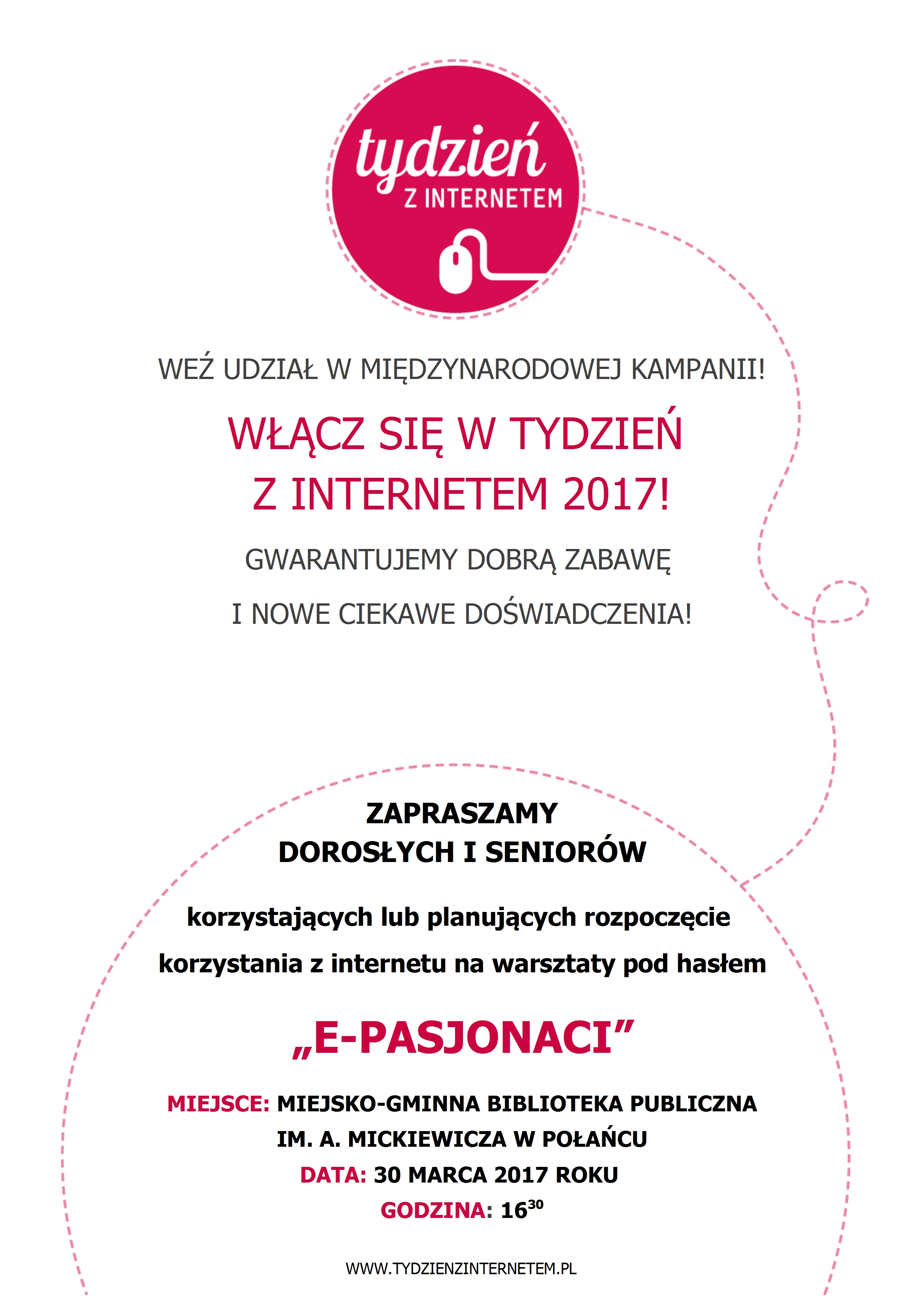 W dniach 27 marca - 2 kwietnia 2017 roku odbędzie się Międzynarodowa Kampania pod hasłem "Tydzień z Internetem 2017". W związku z tym Nasza Biblioteka przygotowała warsztaty dla osób w dorosłych i seniorów, które korzystają lub planują rozpoczęcie korzystania z Internetu.