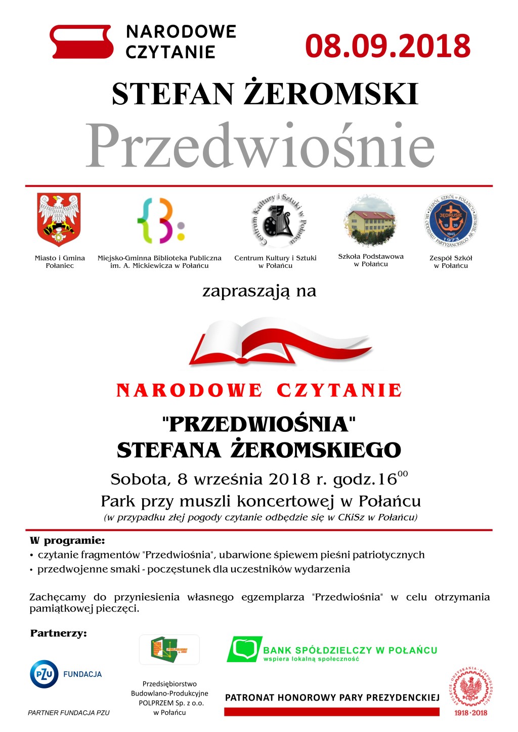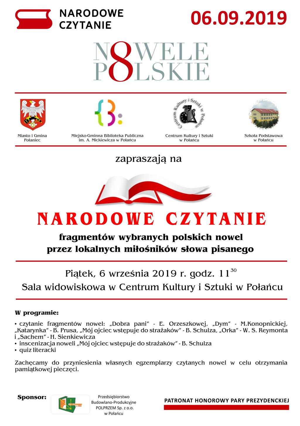 Partnerem czytania w Połańcu była Fundacja PZU, a wsparcia udzielił Bank Spółdzielczy w Połańcu oraz Przedsiębiorstwo Budowlano-Produkcyjne „POLPRZEM” w Połańcu.