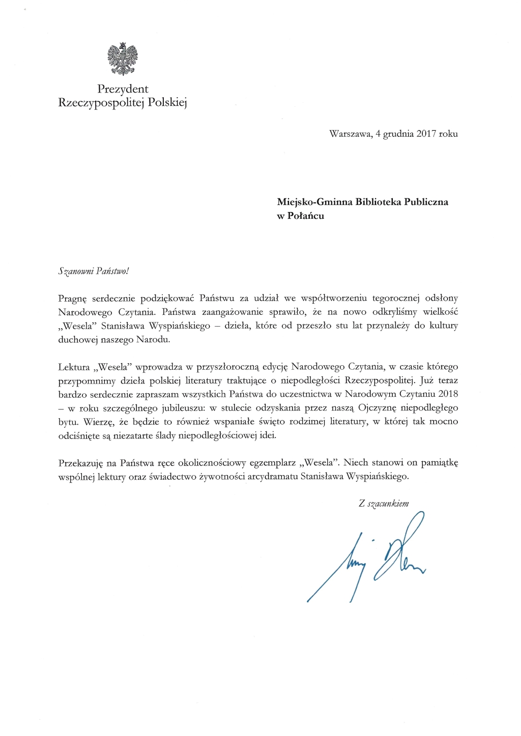 pismo prezydent narodowe czytanie 2017