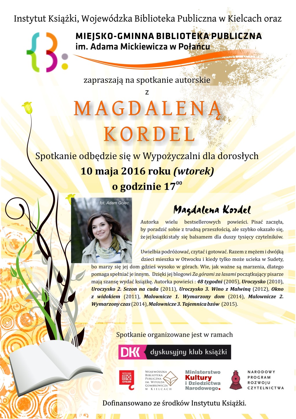 Instytut Książki, Wojewódzka Biblioteka Publiczna w Kielcach oraz Miejsko-Gminna Biblioteka Publiczna w Połańcu zapraszają na spotkanie autorskie z Magdaleną Kordel. Spotkanie odbędzie się w Wypożyczalnia dla dorosłych we wtorek 10 maja 2016 roku o godzinie 17.00.
