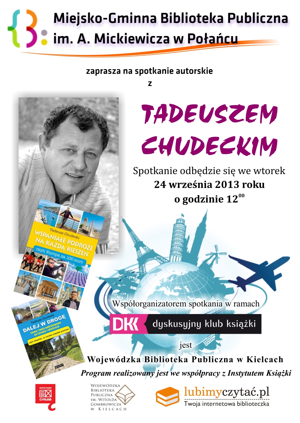 Pasja, lekkość, humor, inteligencja – to tylko część słów opisujących Tadeusza Chudeckiego, który 24 września 2013 roku był gościem w Miejsko-Gminnej Bibliotece Publicznej w Połańcu. Znany m.in. z serialu „M jak miłość” aktor, reżyser, tłumacz, podróżnik, pisze również przewodniki. Spotkanie autorskie w Połanieckiej Bibliotece współorganizowane było w ramach Dyskusyjnych Klubów Książki przez Wojewódzką Bibliotekę Publiczną w Kielcach we współpracy z Instytutem Książki.