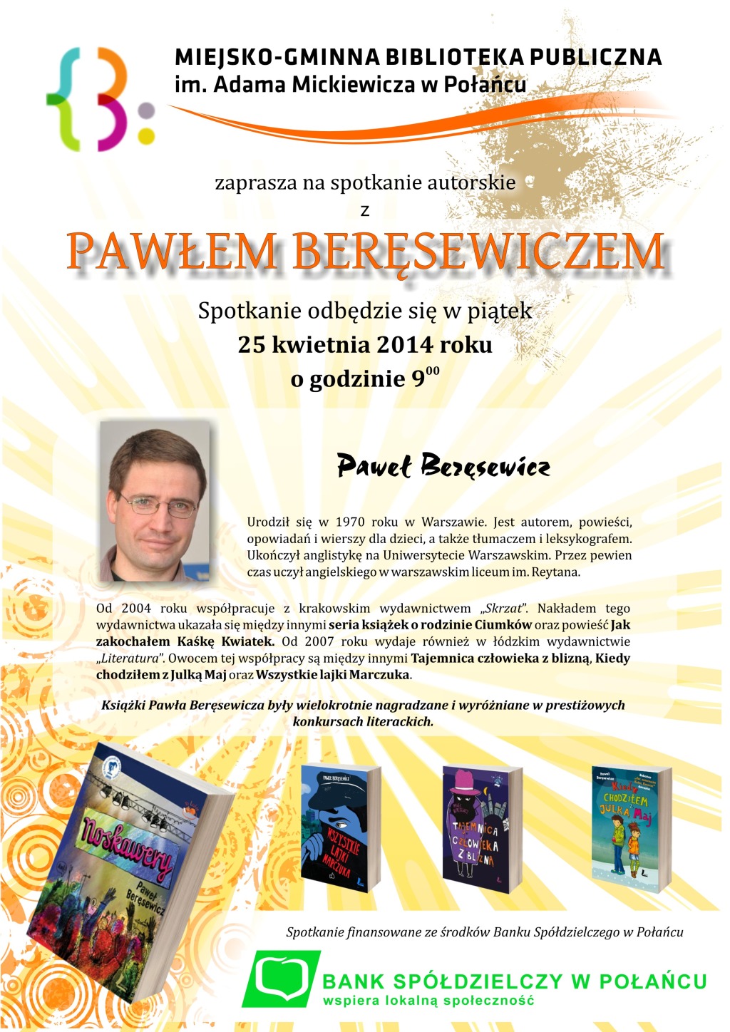 25 kwietnia 2014 roku w Miejsko-Gminnej Bibliotece Publicznej w Połańcu odbyło się spotkanie z Pawłem Beręsewiczem – znanym i cenionym autorem opowiadań, powieści i wierszy dla dzieci i młodzieży, laureatem wielu nagród i wyróżnień za twórczość literacką.