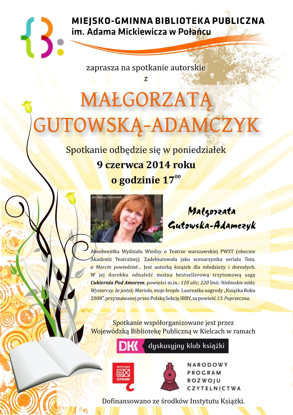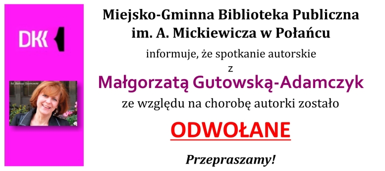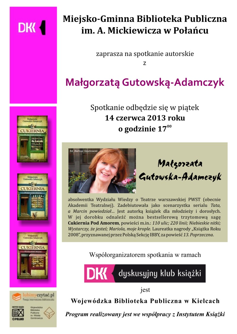 W poniedziałek, 9 czerwca 2014 roku, w Bibliotece odbyło się spotkanie z Małgorzatą Gutowską-Adamczyk, pisarką, historykiem teatru, scenarzystką filmowa i dziennikarką. W jej dorobku odnaleźć można książki dla dzieci i młodzieży („Opowieści Pana Rożka ”, „110 ulic”, „220 linii”) oraz dorosłych („Wystarczy, że jesteś”, „Mariola, moje krople ”, „Serenada, czyli moje życie niecodzienne ”). Zasłynęła jako autorka bestselerowej trzytomowej sagi „Cukiernia pod Amorem”, o której obszernie opowiedziała na spotkaniu.