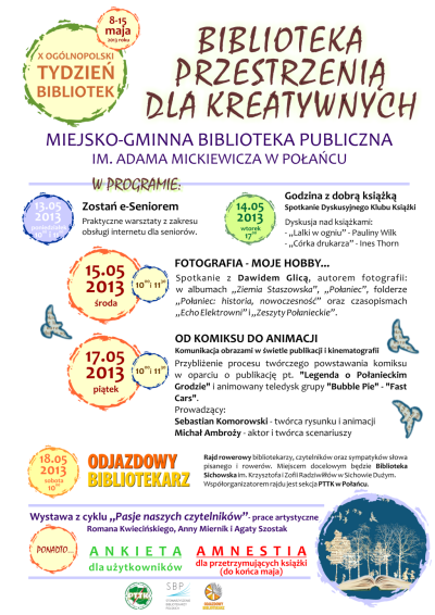 Przedstawiamy program obchodów Tygodnia Bibliotek 2013 w Miejsko-Gminnej Bibliotece Publicznej w Połańcu.