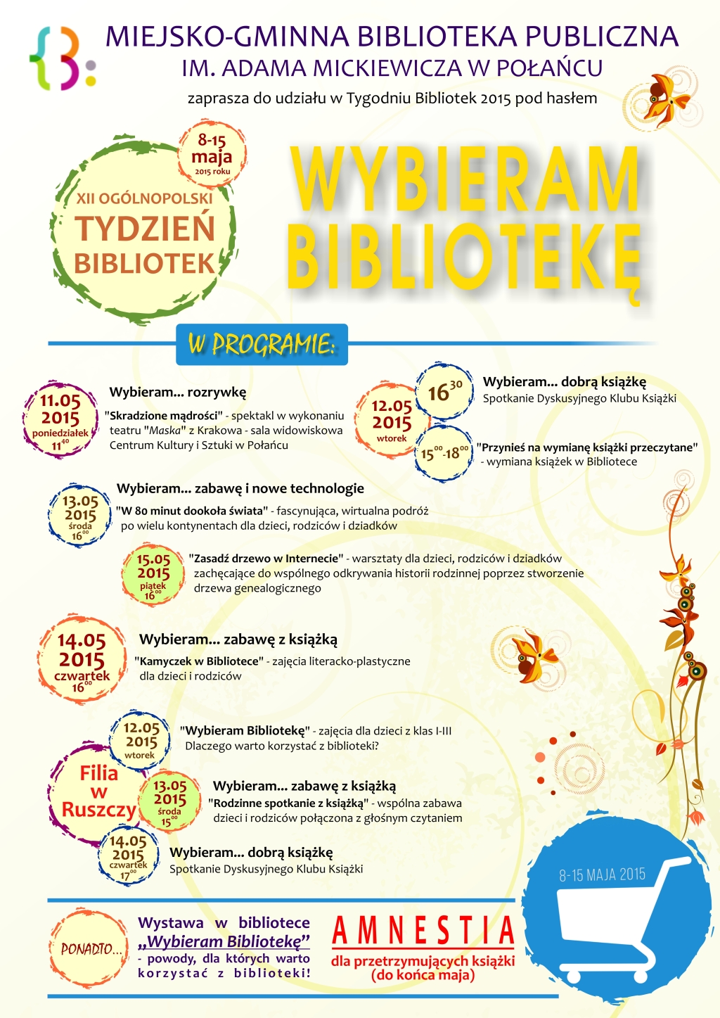 - 13 maja (środa), godzina 1500 – „Rodzinne spotkanie z książką”. Wspólna zabawa dzieci i rodziców połączone z głośnym czytaniem książek