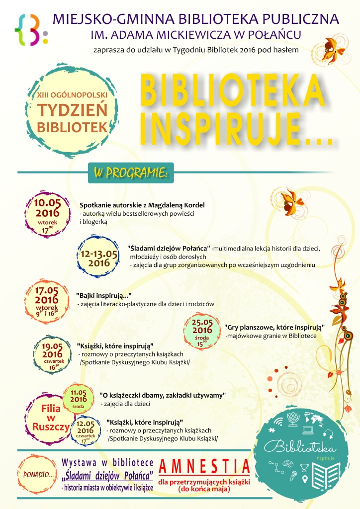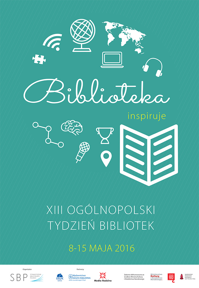 W dniach 8-15 maja 2016 r. odbędzie się XIII edycja programu Tydzień Bibliotek. Jego głównym celem jest podkreślanie roli czytania i bibliotek w poprawie jakości życia, edukacji oraz zwiększenie prestiżu zawodu bibliotekarza i zainteresowania książką szerokich kręgów społeczeństwa.