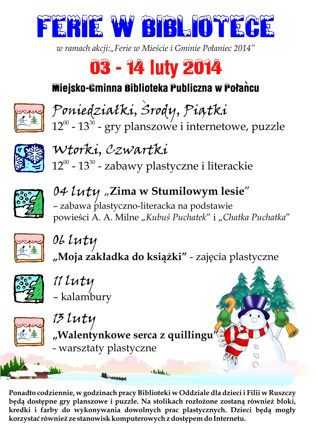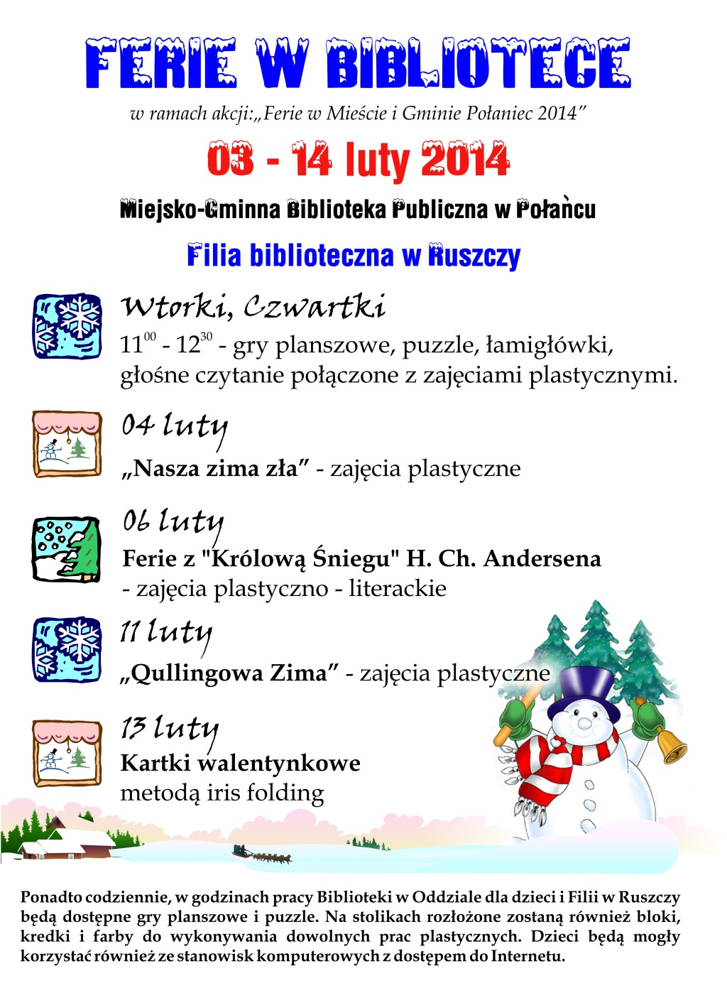W Oddziale dla dzieci i Filii Bibliotecznej w Ruszczy w dniach od 03 do 14 lutego 2014 roku zostaną przygotowane zajęcia plastyczne i literackie oraz gry i zabawy dla dzieci i młodzieży w ramach akcji „Zima w Mieście i Gminie Połaniec 2014”.