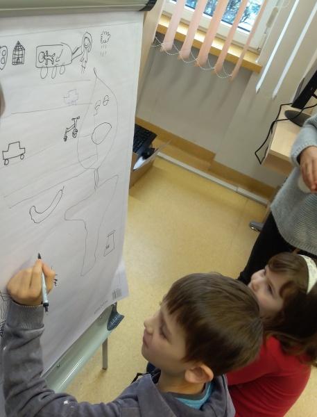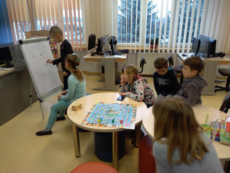 W Oddziale dla dzieci dzieci rozwiązywały łamigłówki oraz brały udział w grach i zabawach logicznych. Do zabawy „Zimowe łamanie głowy” wykorzystany został flipchart, który świetnie spełnił swoją rolę. Dużą dawkę emocji sprawiło odgadywanie zagadek na temat bajek. Uczestnicy zajęć świetnie poradzili sobie ze wszystkimi zadaniami.