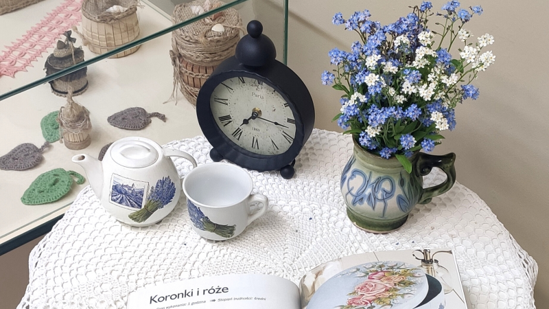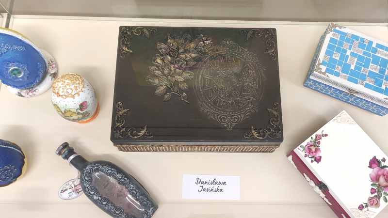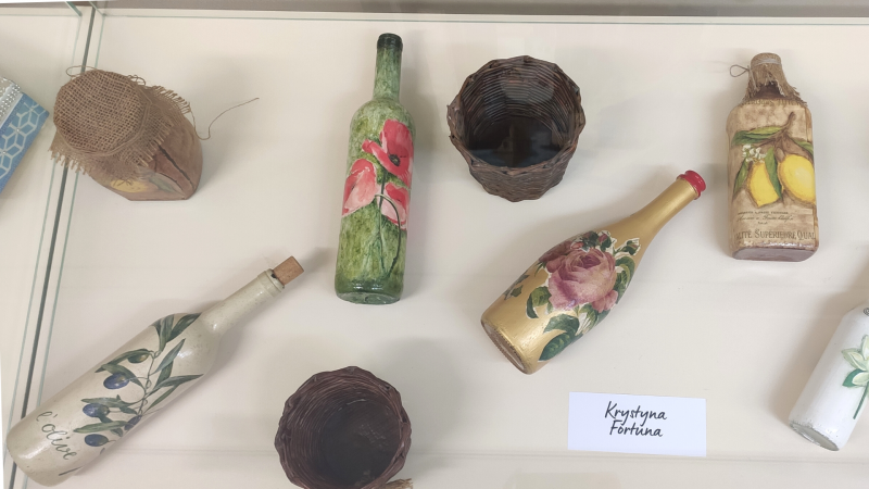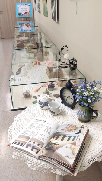 Ekspozycję tworzą prace członków Klubu Seniora "Megawat" - obrazy Pana Ryszarda Komorowskiego, artystyczne przedmioty wykonane różnymi technikami Pani Stanisławy Jasińskiej, Ewy Wanatko (obie Panie należą także do Grupy Plastycznej "Babki na Obcasach") oraz indywidualne prace i rękodzieło naszych Czytelniczek - Pani Krystyny Fortuny i Pani Teresy Martynowicz.