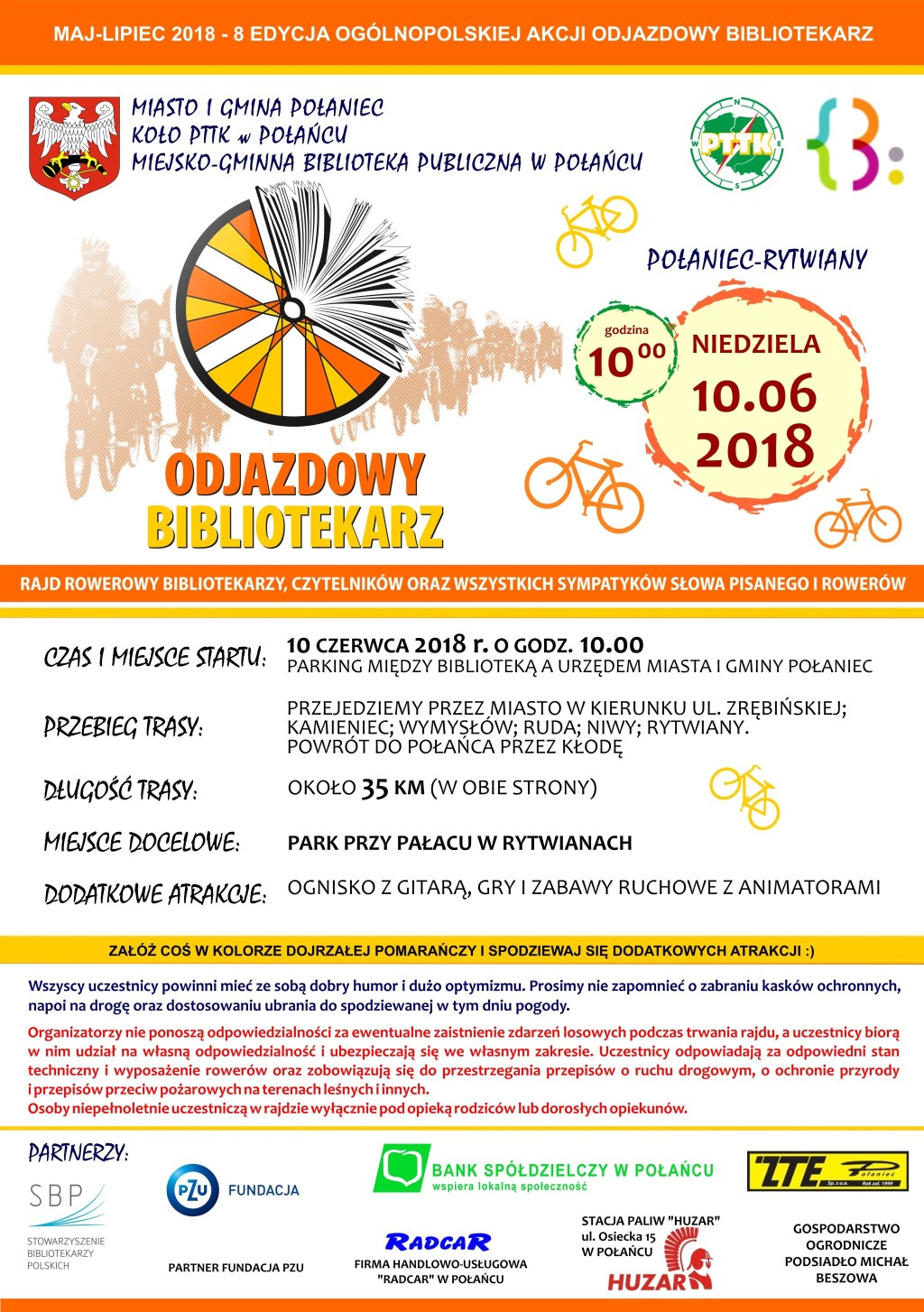 Wszystkim osobom, które w niedzielę, 10 czerwca, były świadkami przejazdu przez Połaniec i okolice licznej grupy rowerzystów w kolorowych (głównie pomarańczowych) koszulkach, pragniemy wyjaśnić: nie, to nie były lokalne eliminacje do Tour de Pologne, ani także próba pobicia rekordu świata w jak „najwolniejszej” jeździe rowerem. To szósta już edycja „Odjazdowego Bibliotekarza”, rajdu rowerowego organizowanego przez Miejsko-Gminną Bibliotekę Publiczną w Połańcu, połanieckie Koło PTTK oraz Miasto i Gminę Połaniec.