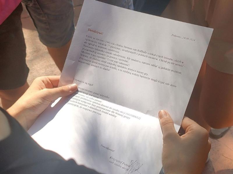 Po spotkaniu autorskim wszyscy wyruszyli z Biblioteki na miejsce gry detektywistycznej. Równo o godzinie 13.00 Krzysztof Petek czekał na uczestników w sztabie akcji. To tu gracze dowiedzieli się o ukrytym przez hrabiego Hermana von Rollholza skarbie i zostali poproszeni o odnalezienie go. Zanim jednak mogli wyruszyć w teren musieli zostać poddani specjalistycznemu szkoleniu obejmującemu techniki łamania kodów, spostrzegawczości, samoobrony i radzenia sobie w trudnych warunkach. W końcu kto wie co mogło ich spotkać w lesie? Chętnych do odnalezienia skarbu było wielu, zatem zostali podzieleni oni na trzy grupy. Na czele każdej z grup stanął dowódca odpowiedzialny za przestrzeganie reguł gry, zasad bezpieczeństwa i za kontakty ze sztabem akcji. Bezpieczeństwo ponad wszystko! To na ręce dowódców została przekazana pierwsza zagadka i klucz do jej rozwiązania. Rozwiązanie jej wymagało skupienia, logicznego myślenia i pracy zespołowej. Było kluczem do odnalezienia kolejnej wskazówki, a ta do kolejnej i kolejnej… Aż do ostatniego finałowego zadania, a było ich wiele. Należało między złamać szyfr zapisany alfabetem Morse’a, odnaleźć ukryty w lesie kamień z zaszyfrowaną wiadomością, spotkać się w lesie z tajemniczym „rudzielcem” a także… zaśpiewać piosenkę o Chińczyku. W przypadku napotkania trudności można było prosić w sztabie akcji o pomoc, jednak podpowiedź drogo uczestników kosztowała… Koniec końców, po niemal trzech godzinach zmagań, wszystkie grupy odnalazły ukryte tropy i rozwiązały zagadki. Ale tylko jedna drużyna mogła odnaleźć skarb! Teraz liczył się czas. Kto pierwszy ten lepszy! Najszybciej miejsce ukrytej szkatuły odgadła drużyna numer dwa. Gracze biegiem wyruszyli by wydobyć skarb! Po otwarciu skrzynki oczom detektywów ukazały się drogocenne pierścienie. Gracze przez chwilę tylko mogli podziwiać skarb, ponieważ należało jak najszybciej zabezpieczyć go w sztabie i wysłać w podróż do muzeum.