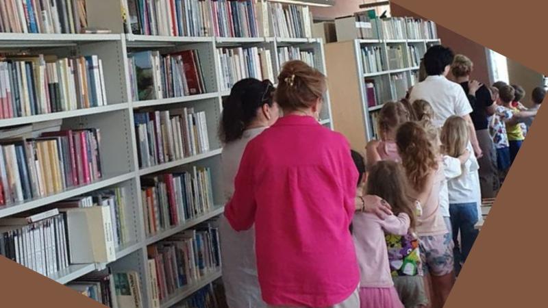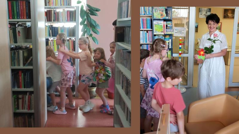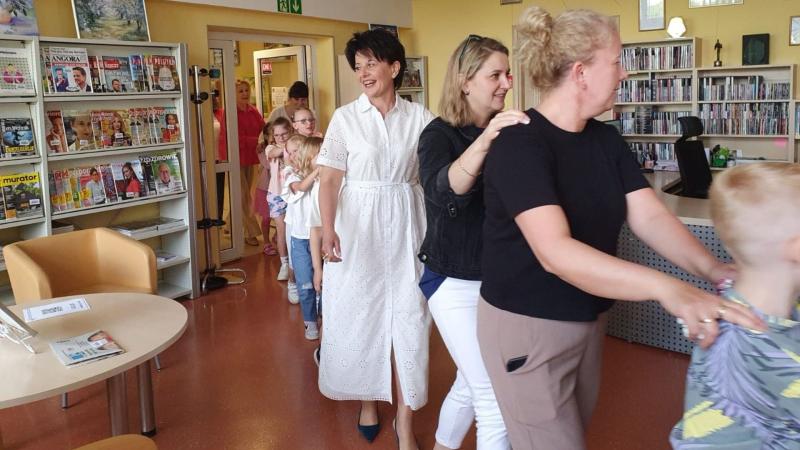 Po wysłuchaniu pięknej interpretacji wspomnianego wiersza dzieci utworzyły „pociąg” i zwiedziły z zachwytem zakamarki biblioteki. Konduktorem była pani Bernarda a w roli maszynisty wystąpiła bibliotekarka. Podczas „podróży” przedszkolaki były zadziwione tak dużą ilością książek na półkach.