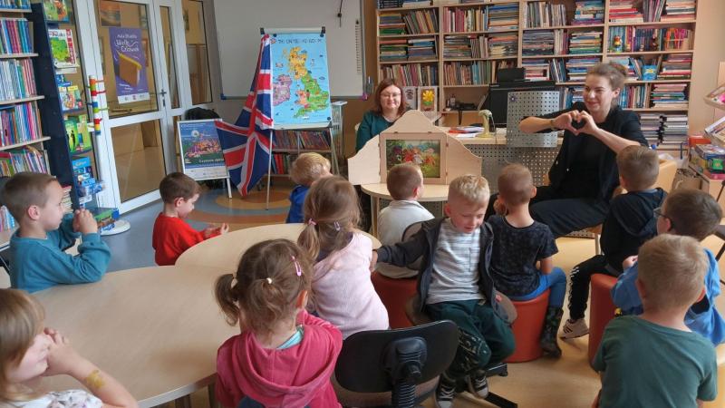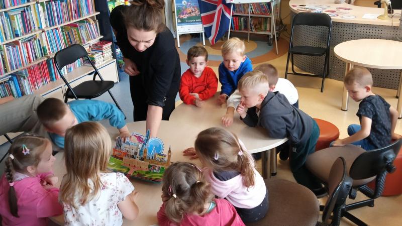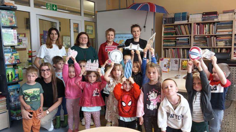 Gościem drugiego dnia była pani Magdalena Swół prowadząca szkołę języka angielskiego English School Połaniec. Tego dnia mali goście również wysłuchali bajki „Złotowłosa i trzy misie” w formie teatrzyku kamishibai, jednak tym razem opowiadanie było czytane w języku polskim przez bibliotekarkę oraz tłumaczone na język angielski przez panią Magdę. Tłumaczenie dostosowane zostało do możliwości poznawczych maluchów. Przedszkolaki aktywnie włączały się do czytania ucząc się najważniejszych angielskich słówek. Nauka poprzez zabawę jest najlepsza! Dzieci podczas spotkania odbyły także "wycieczkę" do Wielkiej Brytanii, poznały najważniejsze angielskie atrakcje, zabytki i kulturę. Pani Magda zabrała ich w podróż dzięki książeczkom z trójwymiarowymi ilustracjami i nagranymi dźwiękami. Na koniec dzieci kolorowały obrazki nawiązujące do dzisiejszych zajęć.