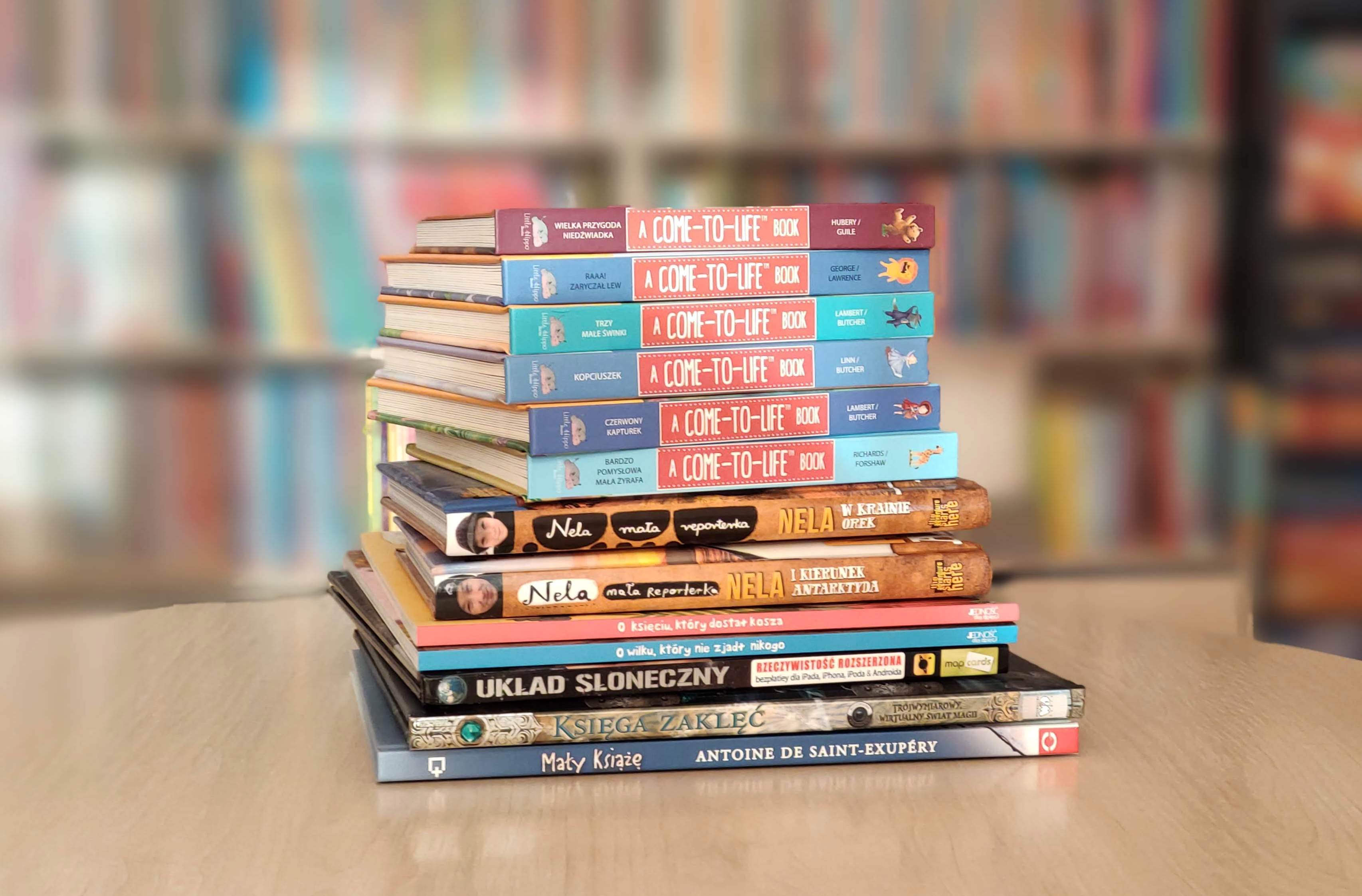 Zdjęcie kolorowe, na stoliku ułożona sterta książek z rozszerzoną rzeczywistością w bezpłatnej aplikacji