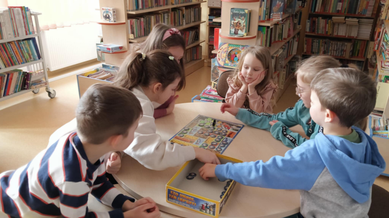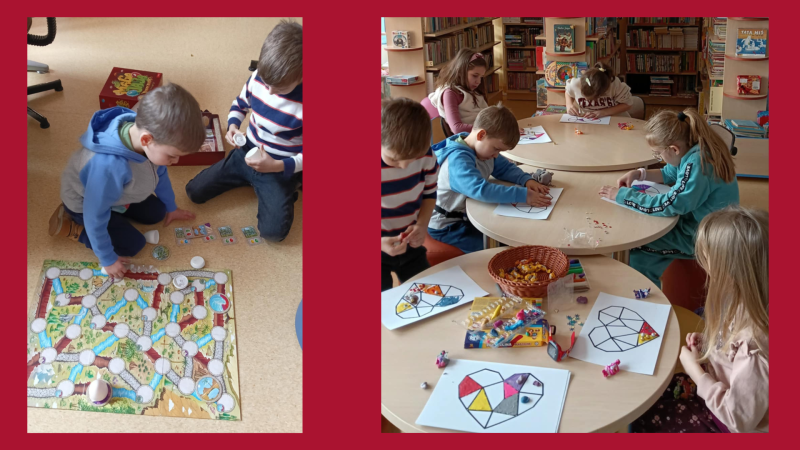 Pozostając w walentynkowym nastroju Biblioludki w sobotę 15 lutego wykonały piękne, mozaikowe serca. Wysłuchały opowieści pod tytułem „Czułość” Antoine Guilloppe o sile uścisków, dodawaniu sobie otuchy, a także o więzi, jaka jest pomiędzy dziećmi i rodzicami. Dużo rozmawialiśmy o istocie przyjaźni, o wzajemnym zrozumieniu i empatii. Na koniec, jak zwykle były gry planszowe.
