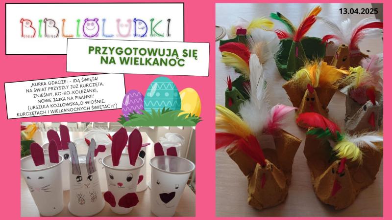 Podczas spotkania Biblioludków w sobotę 13 kwietnia poczuliśmy już świąteczną atmosferę. Kurki i zajączki wielkanocne sprawiły nam wiele śmiechu i radości podczas tworzenia. Były też zabawy, czytanie książek oraz gry.