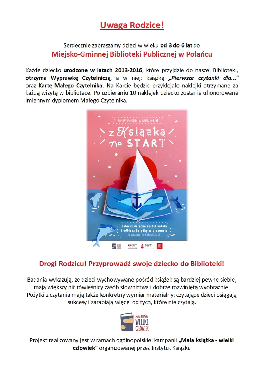 Z przyjemnością informujemy, że nasza Biblioteka bierze udział w projekcie adresowanym do dzieci trzyletnich i ich rodziców w ramach ogólnopolskiej kampanii "MAŁA KSIĄŻKA - WIELKI CZŁOWIEK".