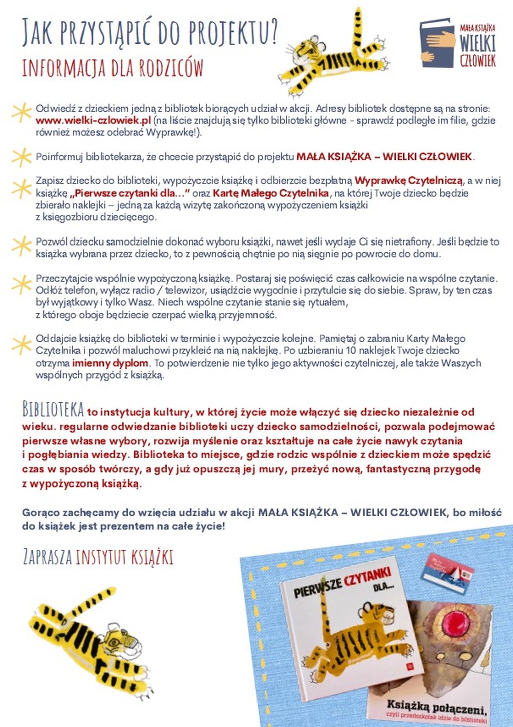 Przypominamy, że każdy „Wielki Człowiek” urodzony w roku 2015, który przyjdzie wraz z rodzicem do biblioteki i stanie się czytelnikiem, otrzyma w prezencie książkę „Pierwsze wiersze dla…” oraz Kartę Małego Czytelnika. W Wyprawce znajdą coś dla siebie także rodzice. „Książką połączeni, czyli o roli czytania w życiu dziecka” to broszura informacyjna, przypominająca o korzyściach wynikających z czytania dzieciom oraz podpowiadająca, skąd czerpać nowe inspiracje czytelnicze.
