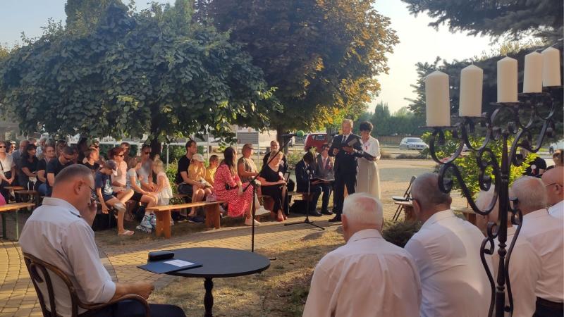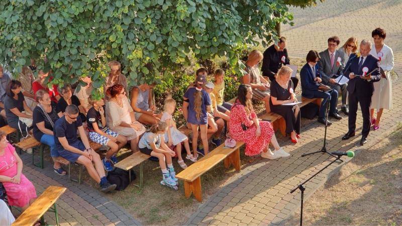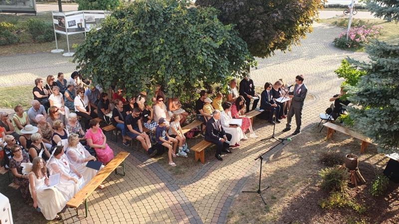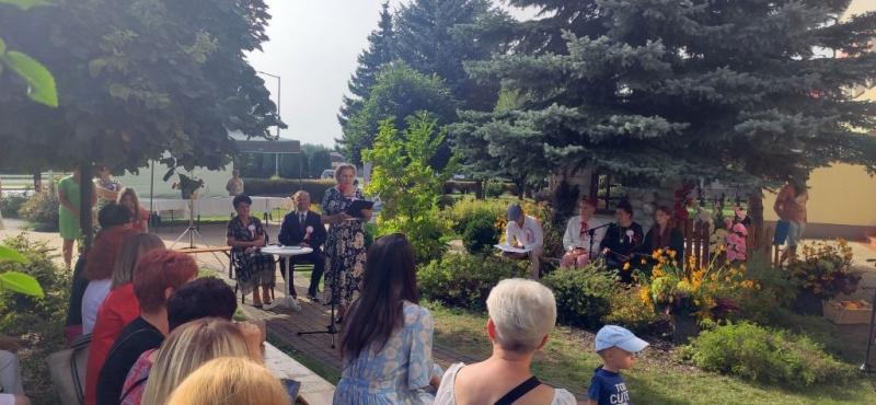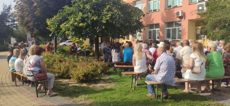 Zdjęcie kolorowe, uczestnicy Narodowego Czytania na placu przed Biblioteką w Połańcu, 3 września 2022 rok