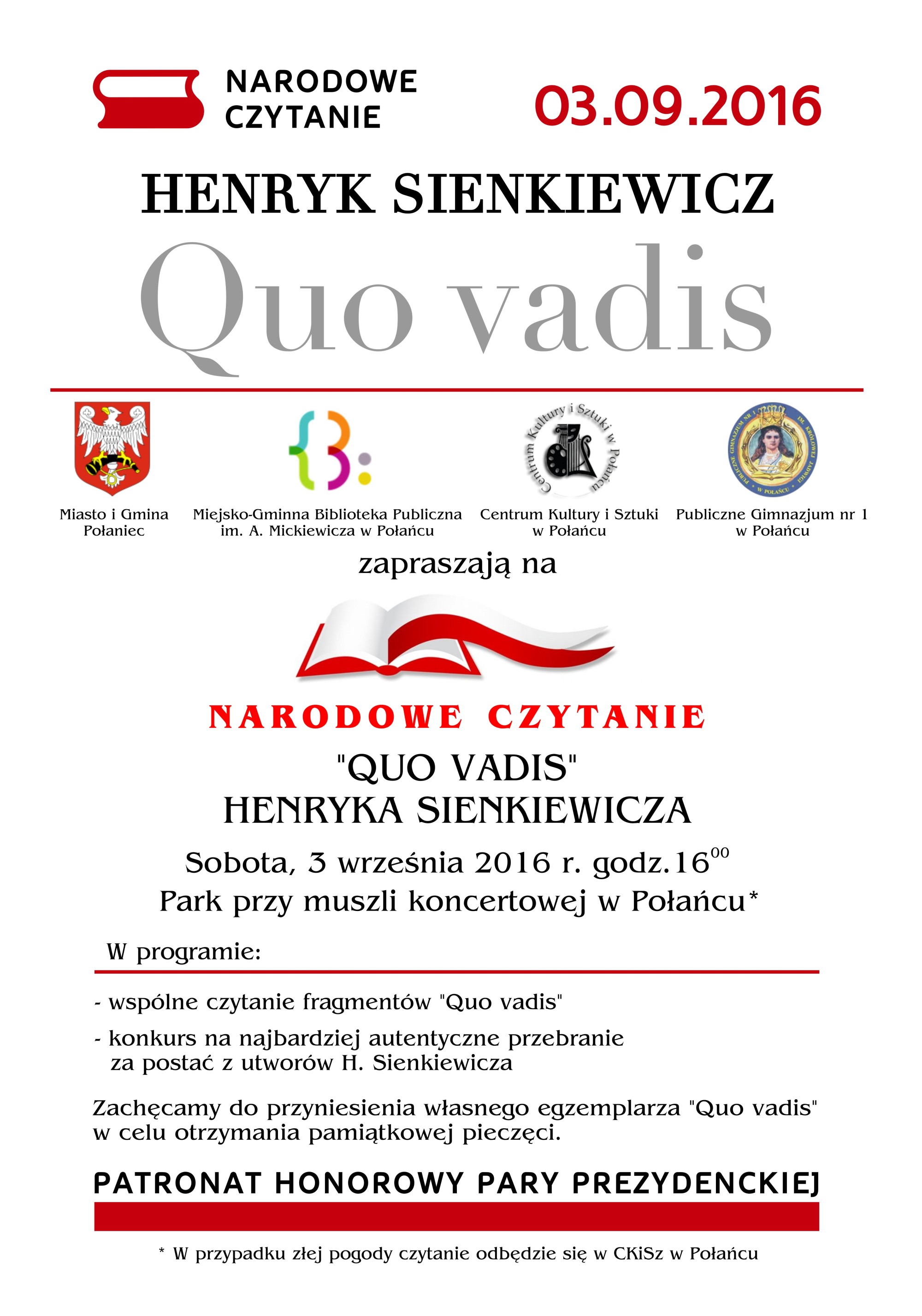 W sobotę, 3 września o godzinie 16-tej, w parku miejskim nieopodal muszli koncertowej w Połańcu mieszkańcy naszego miasta i okolicznych miejscowości zebrali się przy pięknej, słonecznej pogodzie by wspólnie poczytać i posłuchać powieści „Quo vadis” Henryka Sienkiewicza. Organizatorami „Narodowego Czytania” w Połańcu, odbywającego się w całym kraju pod Honorowym Patronatem Pary Prezydenckiej, było: Miasto i Gmina Połaniec, Miejsko-Gminna Biblioteka Publiczna, Centrum Kultury i Sztuki oraz Publiczne Gimnazjum w Połańcu.
