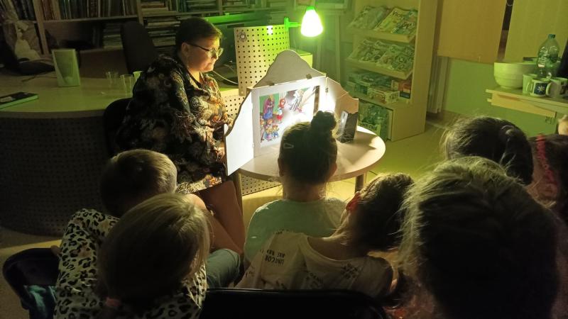 Nowością w tym roku było czytanie bajki kamishibai pod wiele znaczącym tytułem „Noc w Bibliotece” przy przygaszonym świetlne. Jedynym źródłem światła była lampka nocna skierowana na teatrzyk. Był klimat! Dzieci słuchały jak zaczarowane! I nie ma się co dziwić! Nawet dorośli zajrzeli do Oddziału dla dzieci ponieważ na chwilę zrobiło się cicho. A jak wiadomo, gdy dzieci są cicho warto sprawdzić co się dzieje. Na szczęście nie działo się nic podejrzanego. No chyba, że chwilowe zaczarowanie ruchliwych z natury dzieci by siedziały w ciszy i skupieniu można uznać za podejrzane… Biblioteka pełna czarów.
