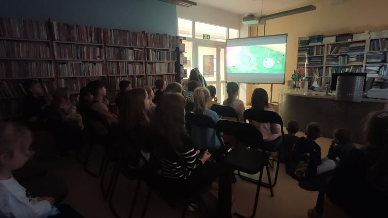 Skoro już wspomniano o filmie, dzięki któremu rodzice i opiekunowie dzieci mieli parę chwil tylko dla siebie, warto dodać, że w tym roku młodsza część uczestników Nocy Bibliotek obejrzała animację "Moja mama gorylica". Bardzo pouczający i emocjonujący film produkcji szwedzko-norwesko-duńskiej na podstawie książki pod tym samym tytułem. Widzów nie brakowało, wszystkie miejsca siedzące, a nawet jak można zobaczyć na zdjęciach, także i leżące zostały zajęte przez młodych kinomaniaków.