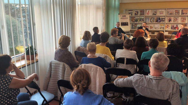 Gdy na dużym ekranie Maja i Lasse szukali zaginionej księgi, dorośli uczestnicy Nocy Bibliotek spotkali się z wyjątkowym gościem – psychologiem i terapeutą. Pani Joanna z gabinetu terapii Kolory. Psychologia Rozwój Inspiracja przedstawiła słuchaczom pozytywne strony jesieni i pokazała sposoby na pokonanie pojawiającej się często o tej porze roku jesiennej chandry. Omówiła mnóstwo przykładów o pozytywnym myśleniu jako sposobie na pokonanie wszelkich ograniczeń. Wyjaśniła pewną zależność - tak jak myślimy o sobie, tak odbierają nas inni. Warto sobie ten fakt uświadomić, by móc rozpocząć w życiu cykl zmian i zacząć rozwijać w sobie poytywne myślenie. Swoje wypowiedzi pani psycholog uzupełniała pokazem krótkich filmików, na których przedstawione zostały między innymi fragmenty z życia osób, które pokonały swoje ograniczenia i zmobilizowały innych do odnalezienia w sobie siły do pokonywania słabości i zmiany myślenia. Linki do filmików zamieszczone są na Facebooku Biblioteki pod postem ze zdjęciami z akcji. Zachęcamy do ich obejrzenia.