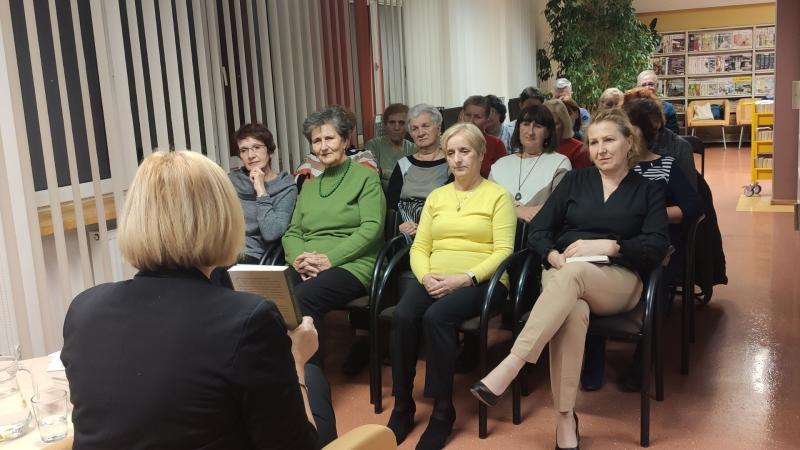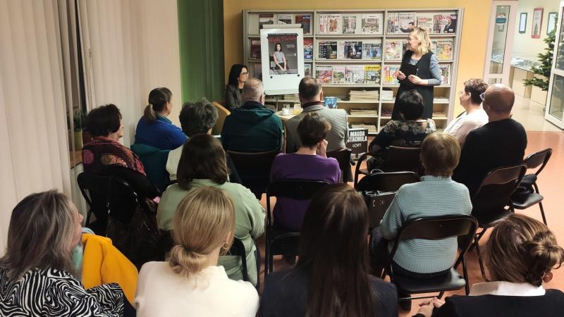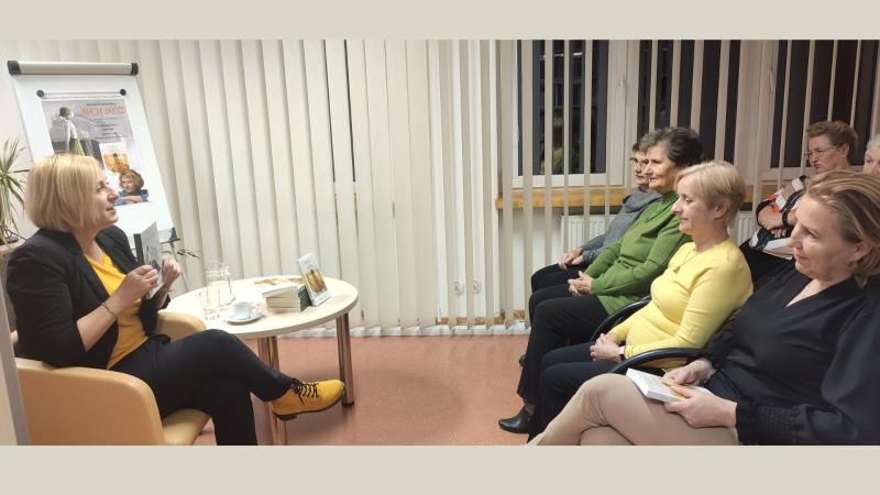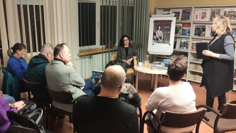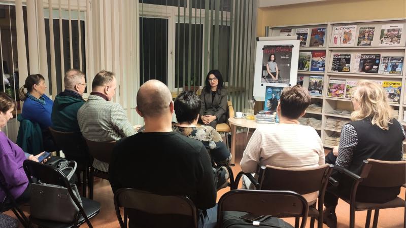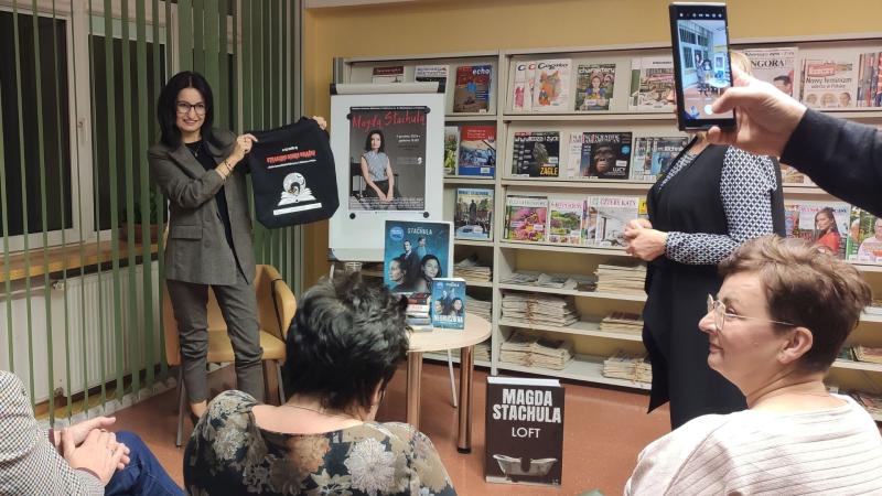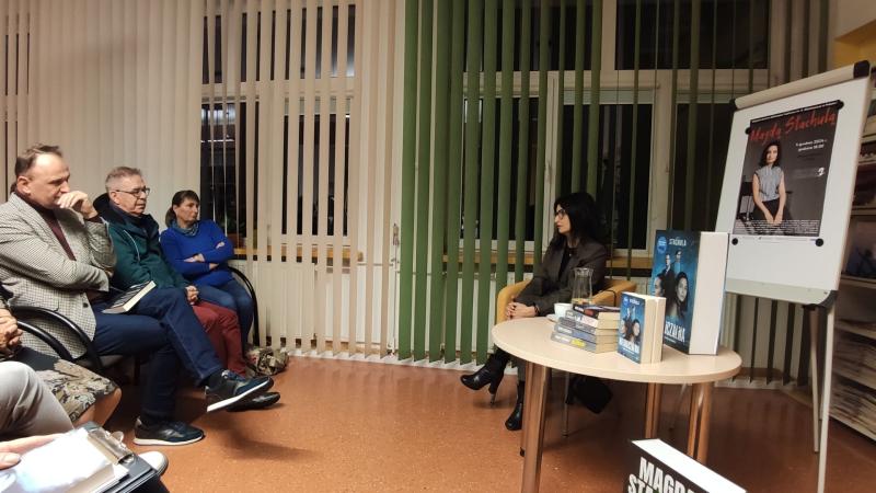 Prywatnie żona i mama dwóch synów, pełnoetatowa pisarka mieszkająca w Krakowie, debiutowała w roku 2016 powieścią „Idealna”. Książka okrzyknięta została pierwszym polskim thrillerem domestic noir i wdarła się szturmem na rynek wydawniczy. Odniosła sukces nie tylko w naszym kraju, ale także poza jego granicami. Została przetłumaczona i wydana w Czechach, we Włoszech i w Ukrainie. Ale to nie jedyna powieść pisarki, która została dostrzeżona i doceniona szerzej, nie tylko przez czytelników. Twórczością pisarki zainteresowali się filmowcy. W 2024 roku na platformie Amazon Prime miał premierę film „Nieobliczalna” na podstawie książki o tym samym tytule. Jest to dla pani Magdy niesamowite wyróżnienie i powód do satysfakcji z dobrze wykonywanej pracy twórczej, o czym chętnie opowiadała na spotkaniu w Bibliotece. Fakt ekranizacji książki wzbudził wśród czytelników obecnych na spotkaniu wiele emocji. Czytelnicy chcieli wiedzieć jak najwięcej o kulisach powstawania filmu, o drodze jaką przebyła książka by zaistnieć na ekranie.