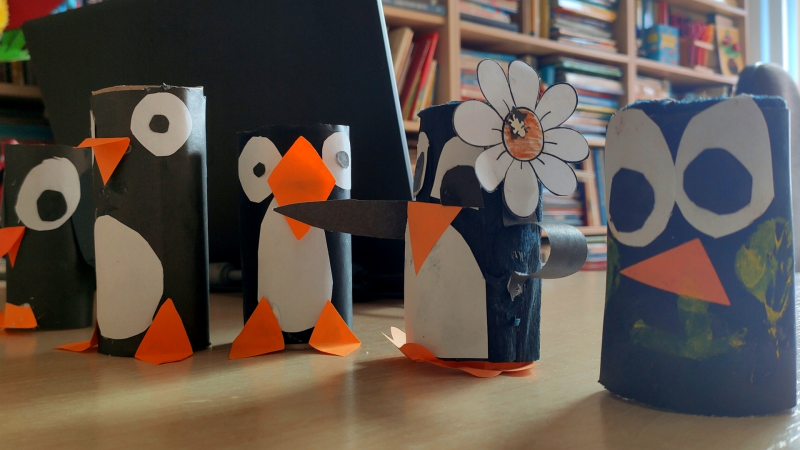 Ferie w Bibliotece w Połańcu rozpoczęliśmy od wirtualnych podróży na zimne kontynenty śladami Neli – Małej Reporterki. Wycieczki odbyły się za pomocą map Google wyświetlanych na tablicy interaktywnej. Zainspirowani książką „Nela i kierunek Antarktyda” podążaliśmy za pingwinami. Odwiedzaliśmy miejsca w których żyją. Podsumowaniem zajęć była praca plastyczna, podczas której powstały pingwinki z rolek po papierze.