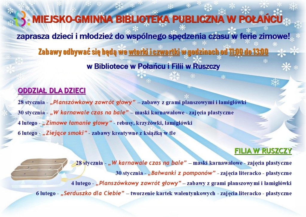 Biblioteka w Połańcu i Filia w Ruszczy zaprasza dzieci i młodzież, które tegoroczne ferie spędzają w domu na dobrą zabawę oraz alternatywę dla biernego siedzenia przed ekranem telewizora, czy komputera.