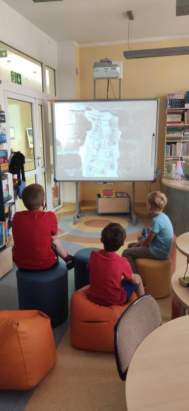 Zdjęcie kolorowe, dzieci podczas zabaw w ferie w bibliotece