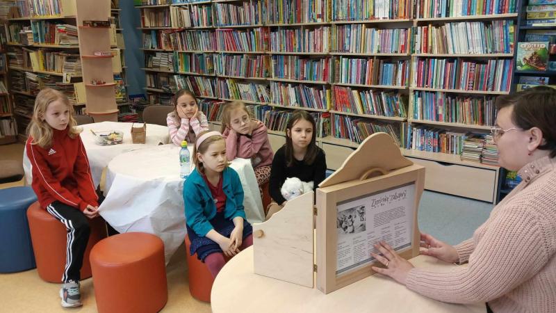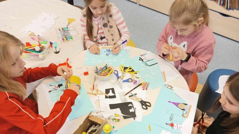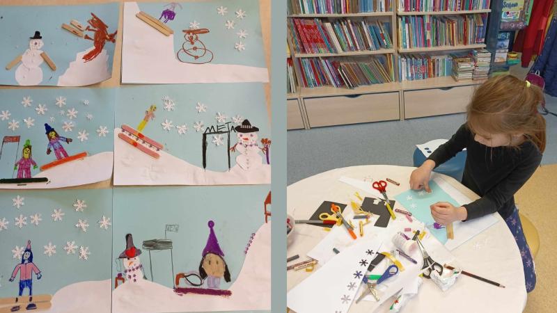 Ferie nie mogą obyć się bez zimowej aury, której w tym roku nie dała nam natura. Zapewniła nam ją za to bajka kamishibai pod tytułem „Zimowe zabawy” Barbary i Tomasza Piątkowskich. Na jej podstawie stworzyliśmy bardzo pomysłowe, iście zimowe prace plastyczne przedstawiające czas spędzony na śniegu. Jak zawsze nie zabrakło pomysłowych rozwiązań – jak chociażby narty z patyczków po lodach. Ostatnim feryjnym zajęciom towarzyszyły farby. Malowaliśmy nimi zimowe drzewa w wesołej atmosferze, którą dopełniły czytane wiersze i opowiadania o zimie oraz gry planszowe i karciane. Dziękujemy za miłe spotkania i bardzo się cieszymy, że nasza biblioteczna oferta na czas ferii przyciągnęła tak wiele osób.
