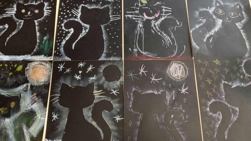 Na kolejnym spotkaniu świętowaliśmy Dzień Kota, który przypada 17 lutego. Obchody tego dnia mają na celu podkreślenie znaczenia kotów w naszym życiu, uwrażliwienie ludzi na los tych zwierząt i rozbudzenie potrzeby niesienia im pomocy. Bo któż nie lubi puszystych, pięknych mruczków? My dzień kota uczciliśmy plastycznie – za pomocą wcześniej przygotowanych szablonów, czarnego papieru i kredek świecowych stworzyliśmy prace przedstawiające kota w pełni księżyca. Pozostając w kociej tematyce czytaliśmy zabawny wiersz Doroty Gellner pod tytułem „Bazyli”, a także graliśmy w gry „Kotobirynt” oraz „O kocie w kłopocie”.